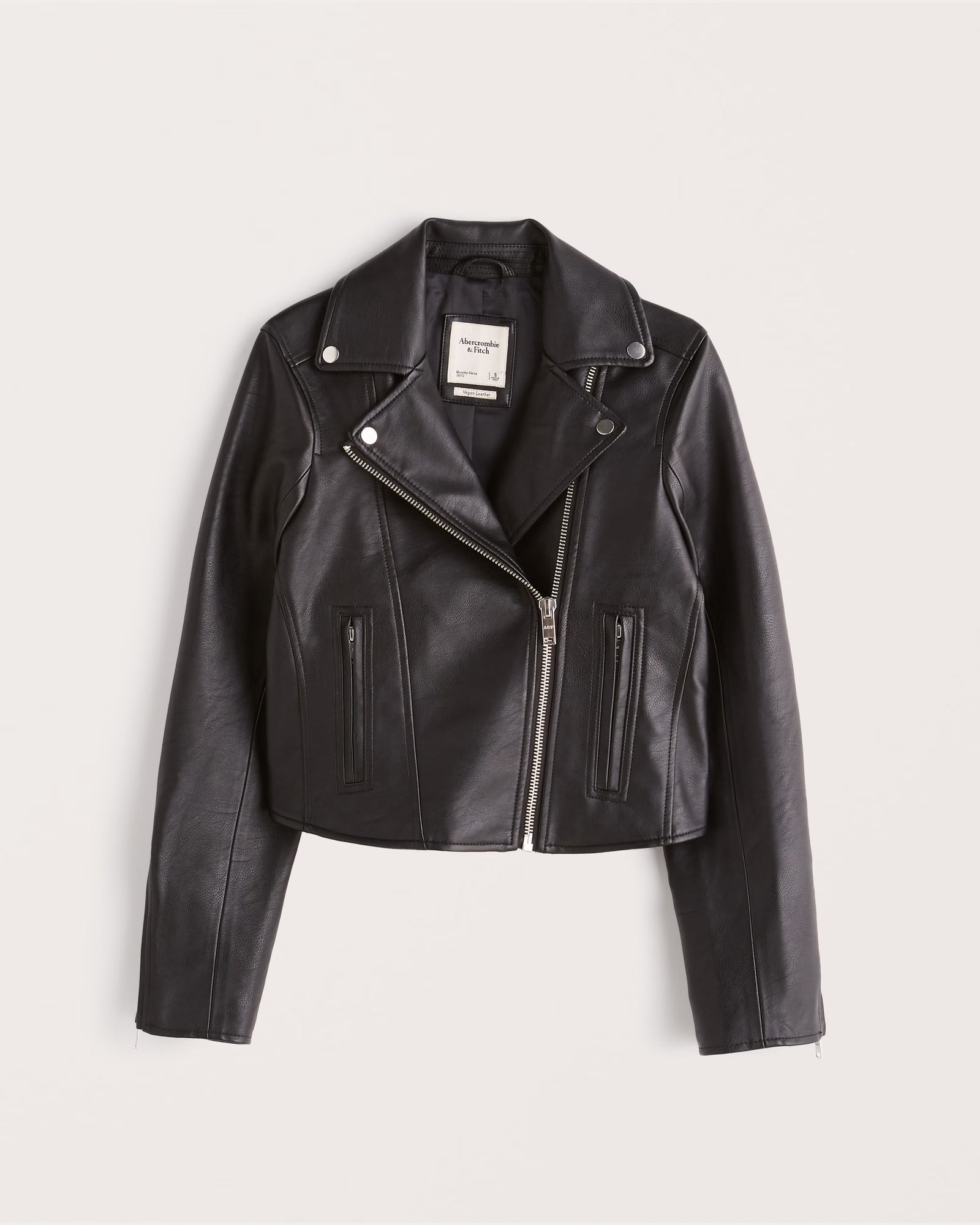 Trending moto jacket in soft vegan leather with classic biker details, pockets and side-slimming seams.